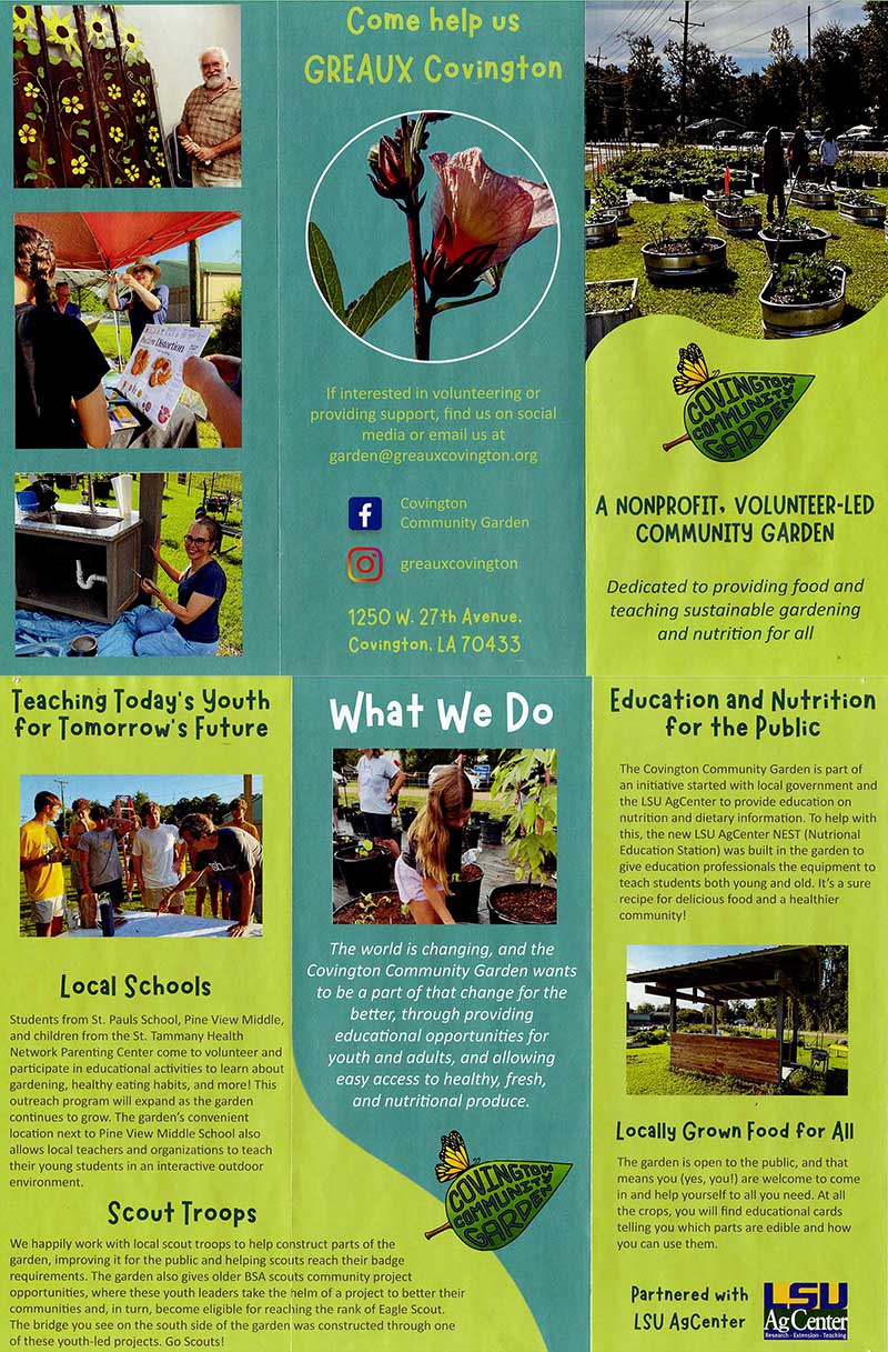 Covington Community Garden has an outreach table, staffed by garden volunteers, to provide information on the community garden and the programs and events held throughout the year. We provide brochures, informational handouts, and when available, seeds for edible plants and samples of produce from the community garden. We will be available to participate in any event when possible. This includes: